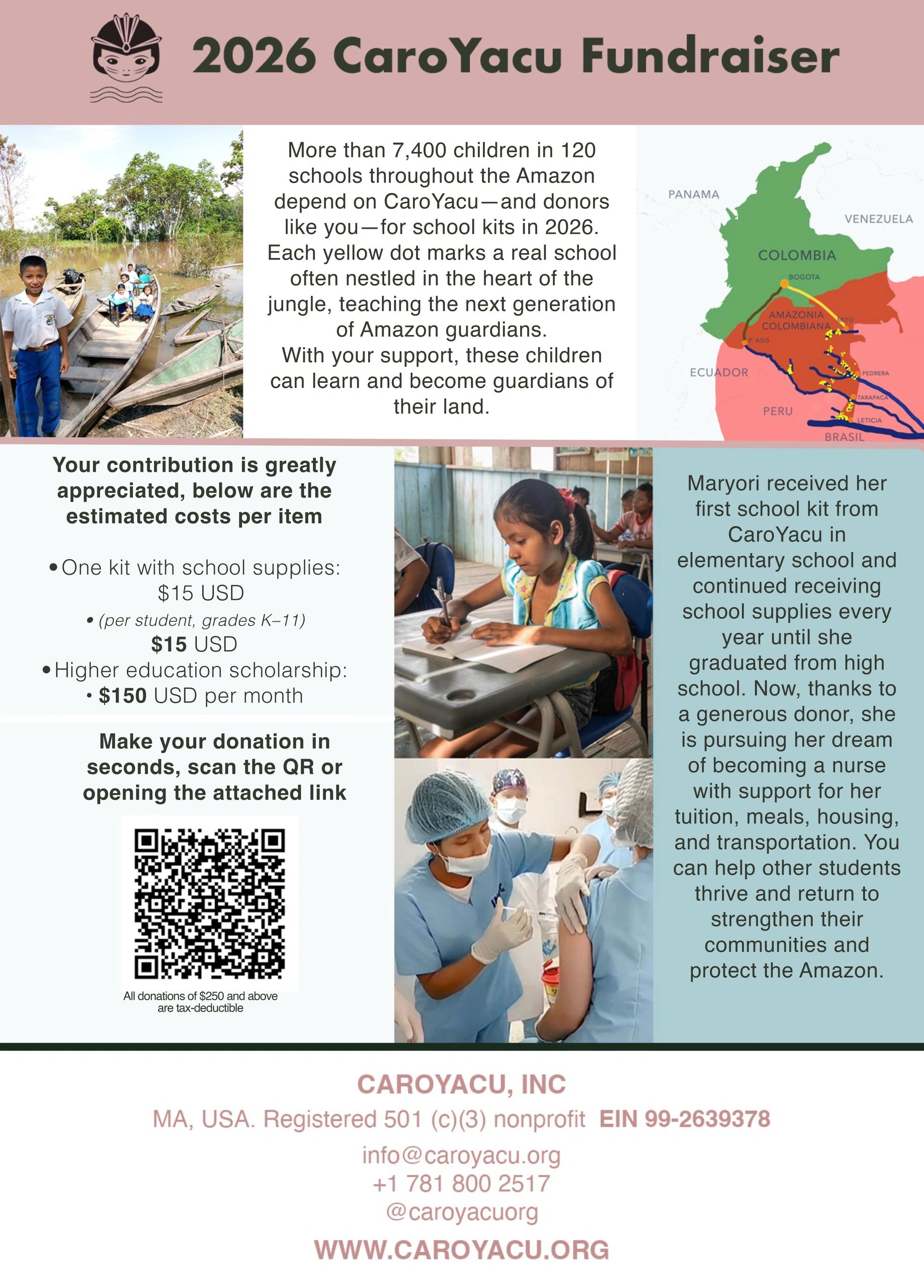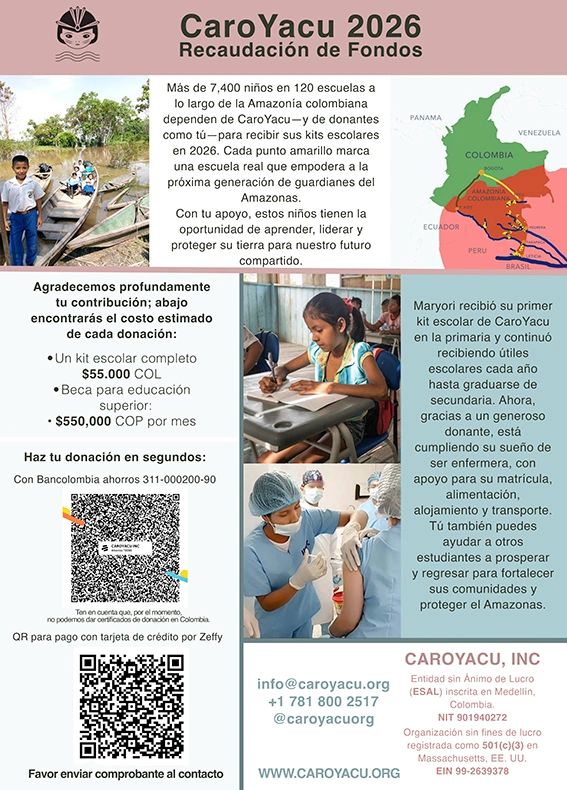 CaroYacu is a 501(c)(3) in the USA and an ESAL in Colombia, charitable organization dedicated to educating and empowering the future stewards of the Amazon rainforest, ensuring that students have access to the tools they need for learning while also preserving their ancestral knowledge.